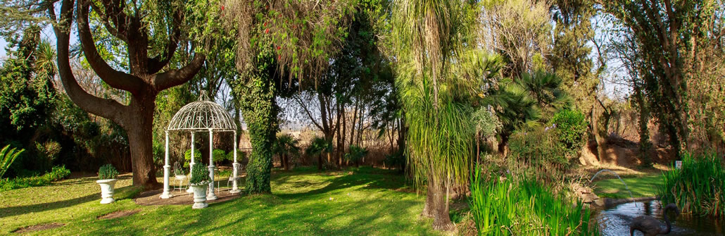 | The Garden Chapel is situated next to our water feature in the main garden area between lush established trees creating a romantic almost forest feel in landscaped gardens with shady trees. |